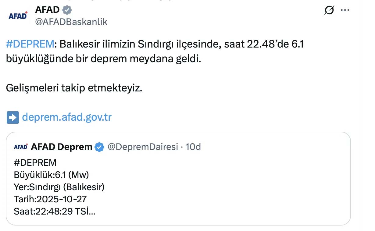 Muhtar Ferdi Geçe, mahallesini ağaçlarla donattıAFAD, saat 22.48'te merkez üssü Balıkesir'in Sındırgı ilçesi olan 6.1 büyüklüğünde deprem meydana geldiğini duyurdu. Deprem başta İstanbul olmak üzere birçok ilde de hissedildi.