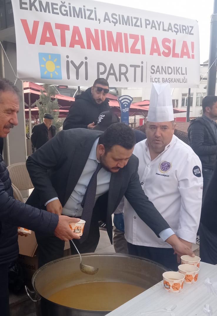 Ak Parti İl Başkanı Şahin'den öğrenci evine ziyaretAfyonkarahisar’ın Sandıklı ilçesinde, İYİ Parti İlçe Başkanlığı, toplumun dayanışma ruhunu canlı tutmak ve milli birlik mesajı vermek amacıyla “Ekmeğimizi, aşımızı paylaşırız; vatanımızı asla!” sloganıyla vatandaşlara çorba ikramında bulundu.
