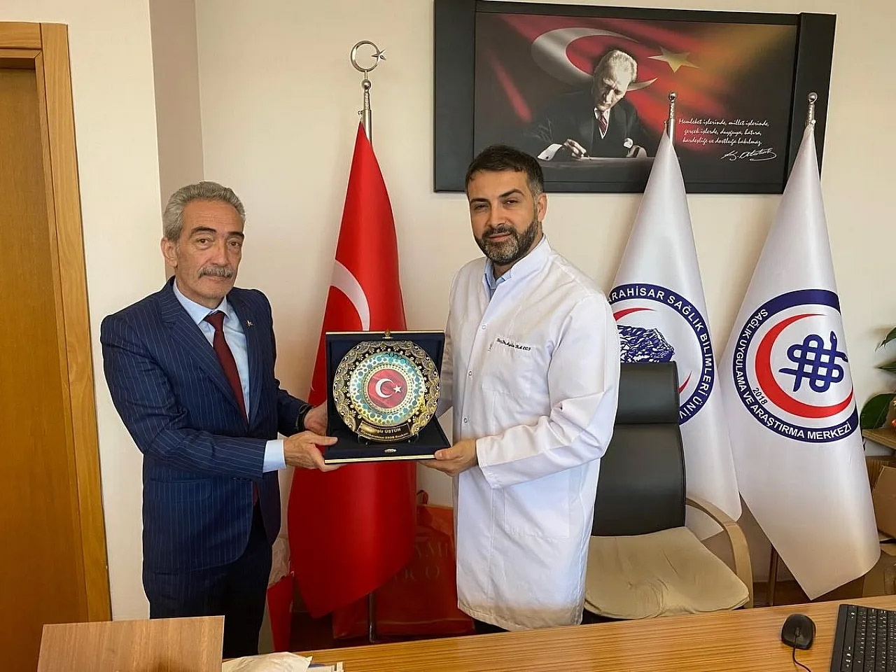 Muhtar Demirci'den sert sözler; ‘Sendikacı mısın, Eşkıya mısın?’Afyonkarahisar Esnaf ve Sanatkârlar Odaları Birliği (ESOB) Başkanı Cengiz Üstün, Afyonkarahisar Sağlık Bilimleri Üniversitesi (AFSÜ) Sağlık Uygulama ve Araştırma Merkezi Başhekimi Doç. Dr. Aydın Balcı’yı makamında ziyaret etti.