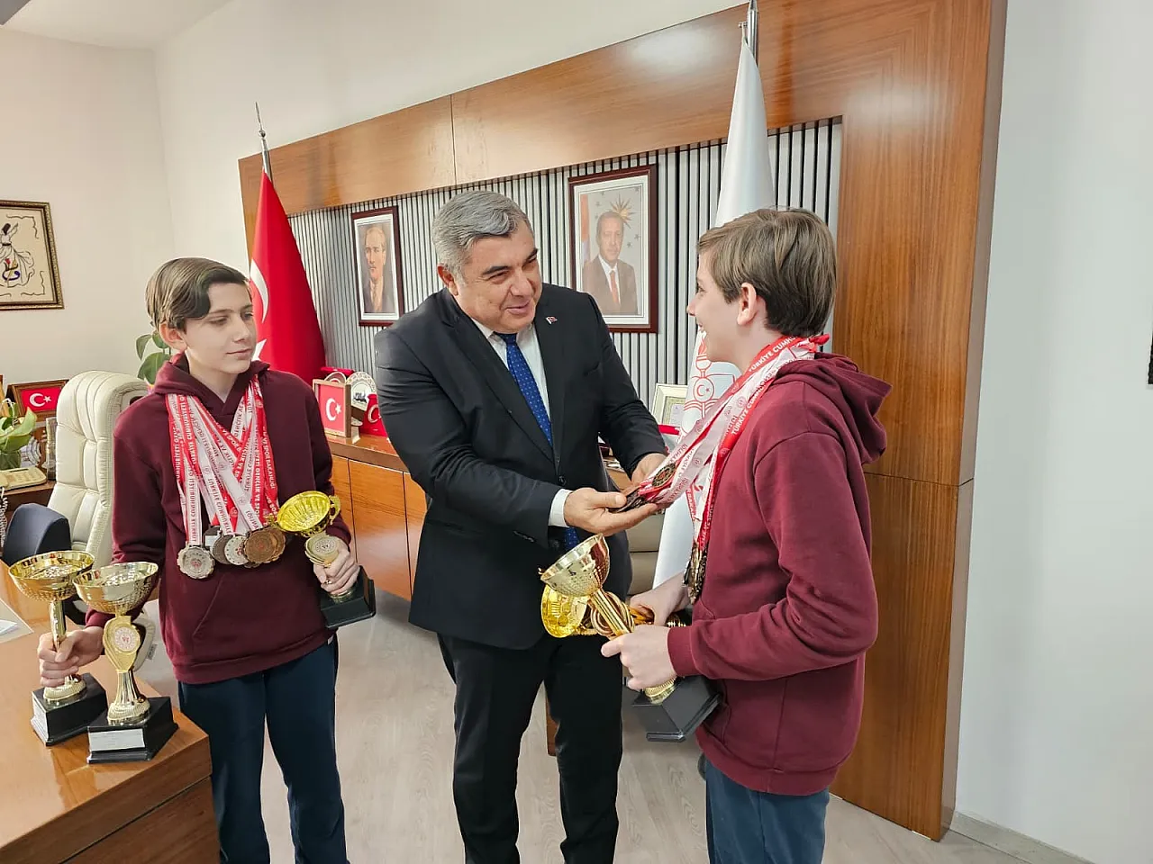 Satranç kadar akademik yönden de başarılı olan öğrenciler, İl Milli Eğitim Müdürü Miraç Sünnetci’yi ziyaret ederek satranç ve Liselere Geçiş Sistemi (LGS) üzerine samimi bir sohbet gerçekleştirdi. Ziyaret sırasında Müdür Sünnetci öğrencilerle yakından ilgilenerek satrancın disiplin, sabır, ileri görüşlülük ve stratejik düşünme becerilerine katkısına vurgu yaparak; “Satranç; hamle yapmadan önce düşünmeyi, sonucu hesap etmeyi öğretir. Bu yönüyle akademik başarıya da büyük katkı sağlar.