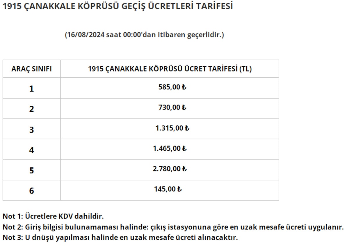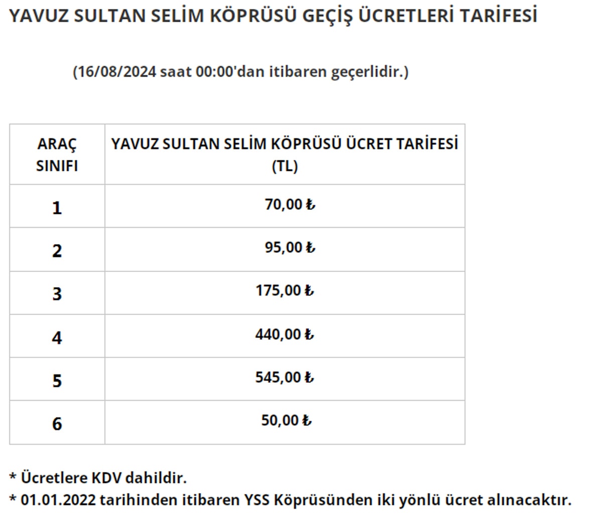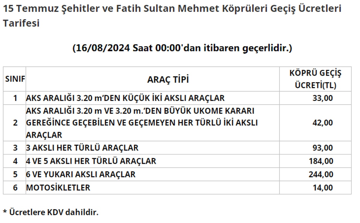 Zam sonrası 15 Temmuz Şehitler Köprüsü ve Fatih Sultan Mehmet Köprüsü'nden otomobiller için geçiş ücreti 33 lira olarak belirlendi. Osmangazi Köprüsü için ise otomobil geçiş ücreti 555 TL oldu. Yavuz Sultan Selim Köprüsü'nden otomobil geçiş ücreti 70 TL'ye yükseldi. Ayrıca, 1915 Çanakkale Köprüsü'nden otomobil ile geçişin maliyeti ise 585 TL olarak açıklandı.