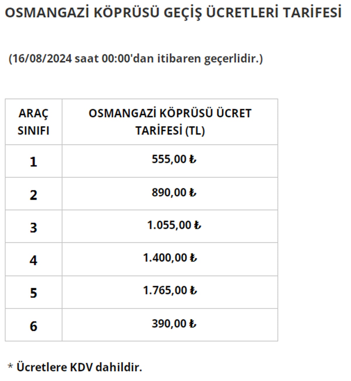 Yeni ücret tarifesi, 16 Ağustos 2024 tarihi itibarıyla yürürlüğe girdi ve sürücüler bu yeni fiyatlarla köprü ve otoyollardan geçiş yapacak.